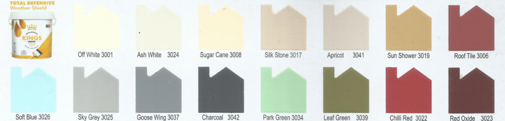 Apricot, Ash White, Charcoal, Chilli Red, Goose Wing, Leaf Green, Off White, Park Green, Red Oxide, Roof Tile, Silk Stone, Sky Grey, Soft Blue, Sugar Cane, Sun Shower
